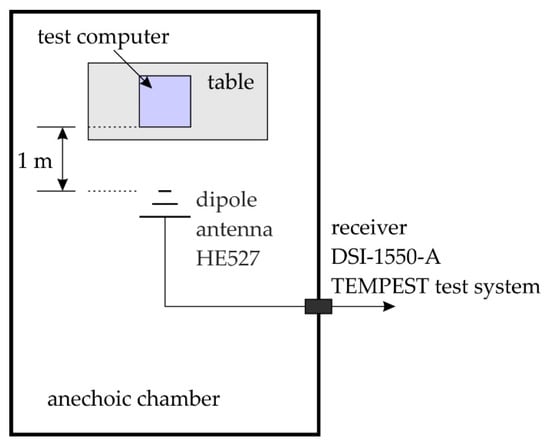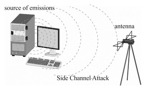 Side-channel attacks (SCA) play an important role in this process. An SCA is created between the source of the emission (how the electrical signal is transmitted—e.g., by video cables in a video graphics array (VGA), which is still very popular in non-public information systems, where the text information is first processed; digital visual interface (DVI); high-definition multimedia interface (HDMI); or display port standards) and an antenna, which receives these emissions (Figure 1). These are called valuable (sensitive) emissions [,,].