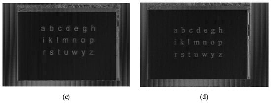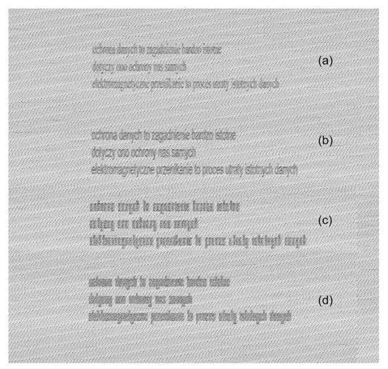 Example of a reconstructed image with the text data for four different fonts: (a) the Times New Roman font, (b) the Arial font, (c) the Safe Asymmetrical font, (d) the Safe Symmetrical font (frequency of the appearance of the valuable emission f0 = 750 MHz; BW = 30 MHz; printing resolution (with character size of 14 p): 600 dpi × 600 dpi; laser printer was the source of the valuable emission).