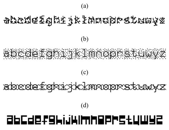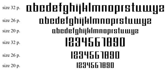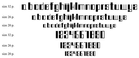 The Safe Symmetrical font is one of two computer fonts that was designed according to safety criteria [,]. This font can be used in the printing process and in computer techniques. This is a typical font used in the processing of text data (i.e., technical documentation, scientific documentation, advertising banners), particularly in the processing of classified data. The characters of the font are devoid of decorative and diagonal elements. The lines that build the characters intersect at right angles. The general contours of the Safe Symmetrical font characters have a rectangle shape. Each character is built from lines of about two widths. The wider lines are the vertical lines of the character, and the horizontal lines are thinner. Additionally, the correct proportions of the line widths and the clearance of each font character are maintained. The corresponding characters have ascenders and descenders. Since the font’s characters do not have decorative elements, it means that the characters of the font are similar to each other, with high values of between-character correlation coefficient. Examples of the lowercase letters and numerical digits are shown in Figure 4.