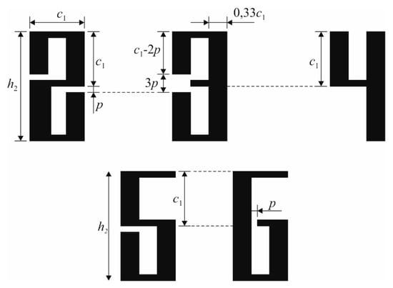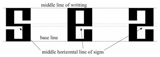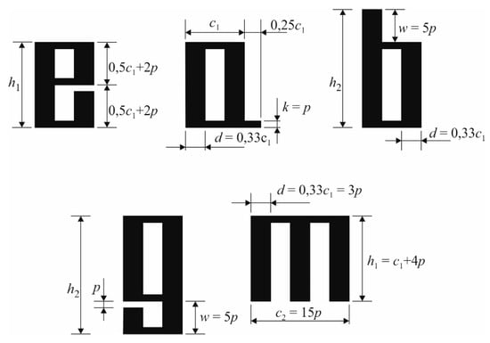 The characters of the font were constructed with the required proportions of the line widths to the clearances as well as the appropriate position of the middle horizontal lines for characters that have such lines. This applies to the lowercase letters, capital letters, and digits (Figure 7).