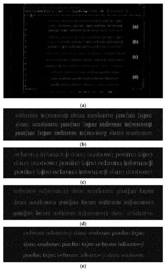 (a) Example of a reconstructed image with the text data for four different fonts (from the top: The Safe Symmetrical font, the Arial font, the Safe Asymmetrical font, and the Times New Roman font). Magnifications of the parts of the image: (b) the Safe Symmetrical font; (c) the Arial font; (d) the Safe Asymmetrical font; (e) the Times New Roman font (frequency of the appearance of the valuable emission f0 = 740 MHz; BW = 50 MHz; size of the characters: 14 p; VGA standard was the source of the valuable emission).