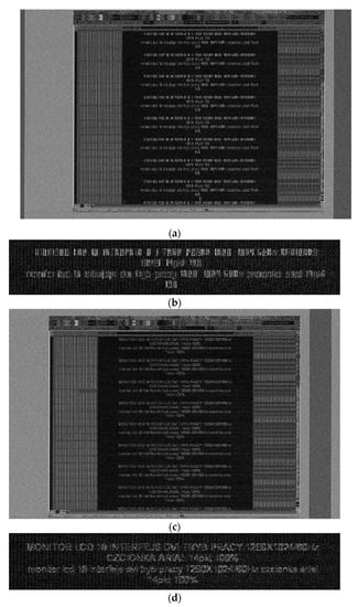 Examples of reconstructed images with the text data: (a) the Safe Symmetrical font, (c) the Arial font. Magnifications of parts of these images are in (b) and (d), respectively (frequency of the appearance of the valuable emission f0 = 1730 MHz; BW = 100 MHz; size of the characters: 14 p; DVI (HDMI) standard was the source of the valuable emission).
