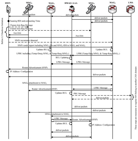 In this scenario, the MN performs a handoff process between two MAGs that reside within the same cluster (i.e., having the same HMAG). Besides, the HMAG performs both the registration and authentication processes, which in turn doubles the processing cost (). LPBU and LPBA messages are created and exchanged between the MAG and the HMAG to update the MN’s location (), since there is no need to access LMA in this scenario. Thus, the can be expressed as: