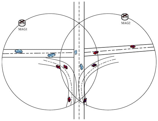 To solve this issue, network-based protocols have been proposed [7,8,9,10,11,12]. In these protocols, the handoff signalling burden is transferred to new entities called Local Mobility Anchor (LMA) and Mobile Access Gateway (MAG) and therefore the Mobile Node (MN) is shielded from the mobility related signalling when it moves between different networks. Although being efficient in terms of power consumption, the network-based protocols do not show the same level of efficiency in terms of handover latency and signalling cost as they usually induce long handover latency and high signalling cost due to the individual processing of the MNs handoff operations. Consequently, group-based technique have been considered by several solutions in order to overcome the issues of signalling cost and handover latency associated with the previous studies, especially when the handover is triggered frequently in a short time for a group of MNs [13,14,15,16]. The proposed studies aim at grouping the MNs’ control messages to minimise the handoff latency and signalling cost through utilising the similarity in the MNs’ movement patterns. Received Signal Strength (RSS) is utilised by most of these studies to discover the MNs’ movement similarity during their roaming. According to the above explanation, the main issue that should be considered during the MNs’ handoff process is: designing an efficient scheme that has the ability to process the MNs’ handoff simultaneously without any service disruption. Thus, the aim of this paper is to propose an efficient scheme for simultaneously moving MNs or MNs having their handoff simultaneously triggered, as shown in Figure 1. The proposed Enhanced Cluster Proxy Mobile IPv6 (E-CPMIPv6) scheme achieves this by utilising the Signal-to-Noise Ratio (SNR) of MNs in order to group the MNs’ mobility-related signalling and to discover the MNs that will perform the handoff at the same time.
