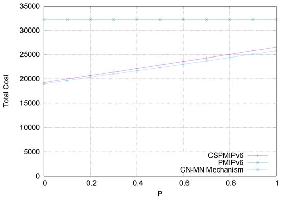 In this subsection, the numerical results are presented according to the explanation in Section 5. The numerical results were obtained based on the values depicted in Table 2. To accurately compare the proposed E-CSPMIPv6 scheme with CSPMIPv6 and PMIPv6 protocols, the same assumptions and parameter values used by Jabir et al. [12] were used in this study.