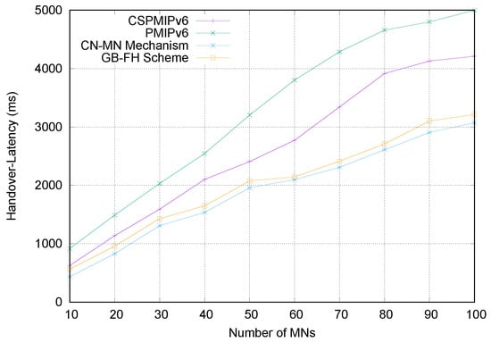 Performance of handoff latency vs. the number of MNs (CN-MN mechanism).
