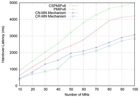 Performance of Handoff latency vs. the number of MNs (CR-MN mechanism).