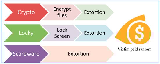 Ransomware was a relatively new type of intrusion attack, with the objective of extorting a ransom from its victim, hence its name ransomware. There are primarily three distinct types of ransomware, as shown in Figure 1. The first type is called scareware. This type of ransomware does not post any real danger to its victim. It mainly tries to scare its victim into paying the ransom. One of the techniques used by scareware is imitating an authority that found some wrongdoing of the victim. It will demand a ransom in order to avoid legal prosecution. Another slightly different scareware threatens to expose the victim’s wrongdoing to the victim’s family and friends, therefore another name for it was called leakware.