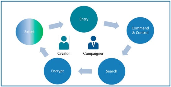 To understand the PEDA, we must first understand the behavior and characteristics of crypto-ransomware. Crypto-ransomware infection can be divided into five stages: Entry, command and control (C&C), search, encrypt and extort. This is illustrated in Figure 2. At the entry stage, the crypto-ransomware will self-propagate and complete its setup processes. More advanced crypto-ransomware will have additional tasks, such as payload persistence, restrict system restore, stealth mode, environment mapping and privilege elevation [26,27].