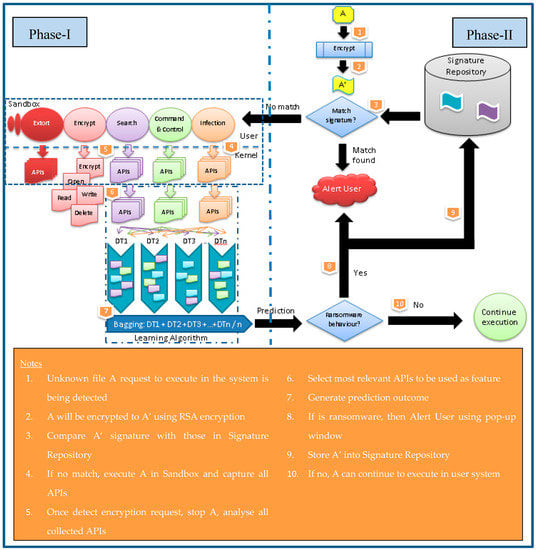 In Phase-II, once the unknown file is determined to be a crypto-ransomware, the file’s signature will be stored in an SQL database, which is also called the Signature Repository (SR). A signature is produced by encrypting the file using the Rivest–Shamir–Adleman (RSA) method with no file extension. The purpose of creating the Signature Repository is to allow a significantly earlier detection of known crypto-ransomware. The process flow is shown in Figure 3.