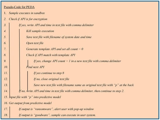 In this research, we have proposed an algorithm, PEDA, that will detect the crypto-ransomware before the encryption process starts, as shown in Figure 3, in order to avoid valuable files from being held for ransom. PEDA consists of two phases, Phase-I is the learning algorithm, and Phase-II is the signature repository algorithm. Figure 4 shows the pseudo-code for PEDA.