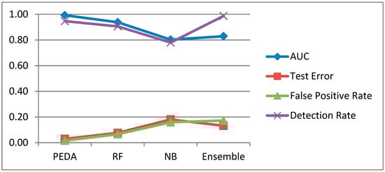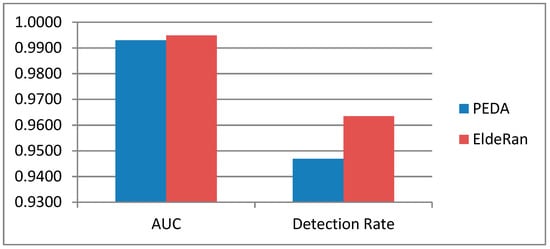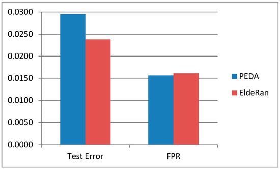 In the third experiment, PEDA-Phase-I is compared to the EldeRan algorithm. The result is shown in Figure 7 and Figure 8. Based on the results, it can be observed that PEDA-Phase-I and EldeRan perform very closely with each other. EldeRan performs better with the AUC of 0.9949, and the detection rate of 0.9634 as shown in Figure 7. Meanwhile, Figure 8 shows that EldeRan has a lower test error of 0.0238, but PEDA-Phase-I has the lower FPR of 0.0156, which shows that it is less likely to produce a false alarm.