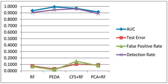 In the second experiment, the performance of the PEDA-Phase-I algorithm is compared to RF, and RF with 2 feature selection algorithms, to improve the performance of RF. The result is shown in Figure 6 below. Based on the result, Correlation-based Feature Selection (CFS) helps to improve the RF to achieve the highest detection rate of 0.9647, while it still fails to improve other metrics due to the high number of false negative predictions. Meanwhile, when using Principal Component Analysis (PCA) as a feature selection for RF, it performs worse than RF alone in all of the measured metrics.
