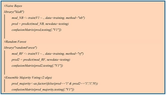 To gauge the performance of the LA model, we compared it with three other algorithms. The random forest (RF) and Naïve Bayes (NB) algorithms were selected based on our references [31,32]. The third algorithm was the Ensemble (of RF and NB), which was selected using majority voting [33,34]. The R code is as shown in Figure 9 below.