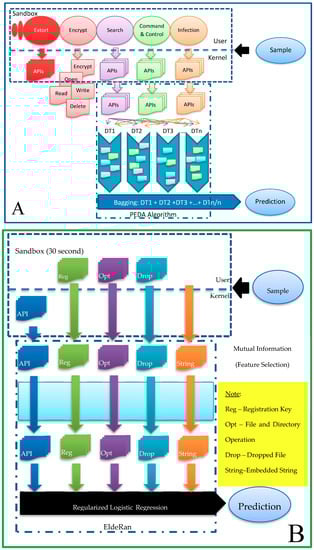 The last algorithm we compared with was the EldeRan algorithm [30], and the algorithm comparison is shown in Figure 10. Figure 10A is stated as a partial PEDA, because we used the RISS dataset that cannot distinguish between API before encryption and API after encryption, which is required by PEDA. However, the PEDA model had only used API data from the RISS dataset. Another important distinction for the PEDA model is the specification for crypto-ransomware, while RISS has both crypto-ransomware and locky-ransomware. Figure 10B is the EldeRan model that uses the whole RISS dataset that includes API, the registration key, file and directory operation, dropped file and embedded string. Dropped file data indicates that the RISS dataset contains data after the encryption stage, because ransomware will only drop the file after encryption had been accomplished. In the EldeRan model, first the data will goes through feature selection using Mutual Information. After that, the selected features will be trained and tested using Regularized Logistic Regression to predict the binary classification.