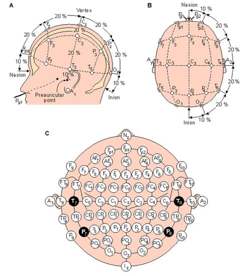 Electroencephalographic (EEG) electrodes following the international 10–20 system; (A) left the head; (B) above the head; (C) location and nomenclature of electrodes.