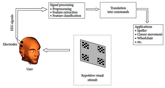 This research work consists of classifying user’s thoughts in order to translate them into commands, such as controlling wheelchairs, cursor movement, or spelling. As is illustrated in Figure 2, our proposed method followed a functional model, as is the case for any BCI, which was achieved through three main phases: data acquisition and preprocessing, feature extraction, and classification of brains activities.