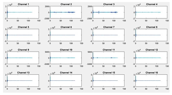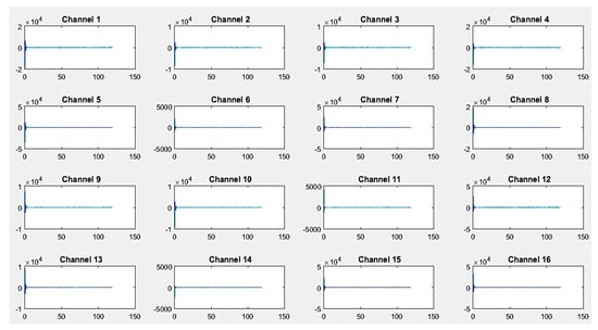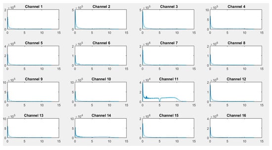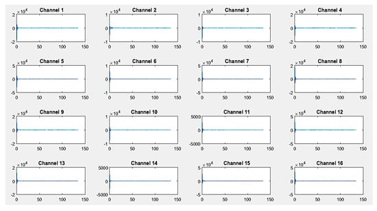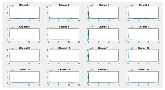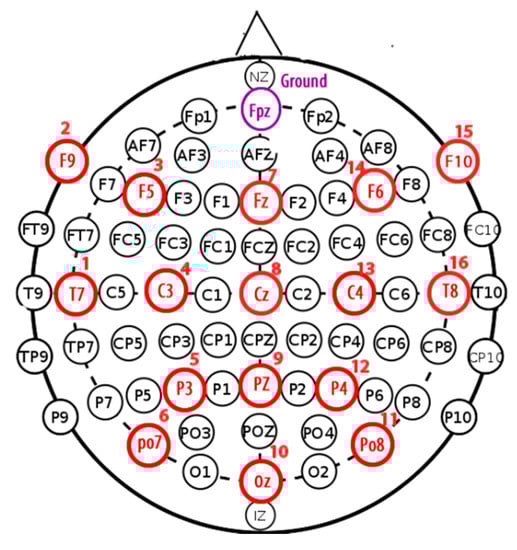 Each subject was equipped with a helmet containing 16 channels, respecting the international 10-20 system (Figure 4), and each channel provided 30,436 samples over 120 seconds.