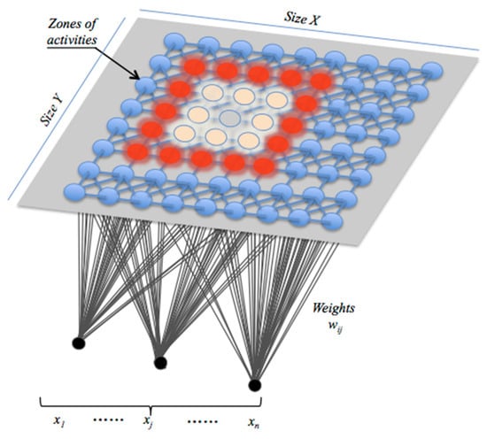 The learning phase implements a learning process based on a self-organizing map (SOM) and computes data according to a random and cyclic algorithm, which begins in our case by initializing whole activities associated with each BCI sensor. Developed by Kohonen, SOM is organized around a set of interconnected processing neurons intended for competing signals []. The SOM network belongs to the category of unsupervised learning networks, and does not require any human intervention. As is illustrated in Figure 5, it can map the input data space spanned by onto a one- or a two-dimensional array of neurons. It also represents a clustering concept by grouping similar data together, reducing data dimensions at the end and displaying similarities among data. Once received, the network learns that data until satisfying an error criterion. Input variable values are gradually adjusted in an attempt to preserve neighborhood relationships that exist within the input data set. The neuron location in the map is very important, and as it gets closer to the input object, the vector weights of the winning neuron are adjusted along with its neighbors.