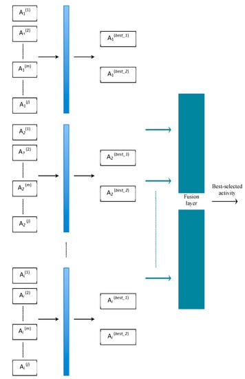 In our case, we considered five activities, as illustrated in Table 2. The proposed classifier architecture integrates two more layers, implementing best activities selection (BAS) and fusion functions.