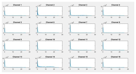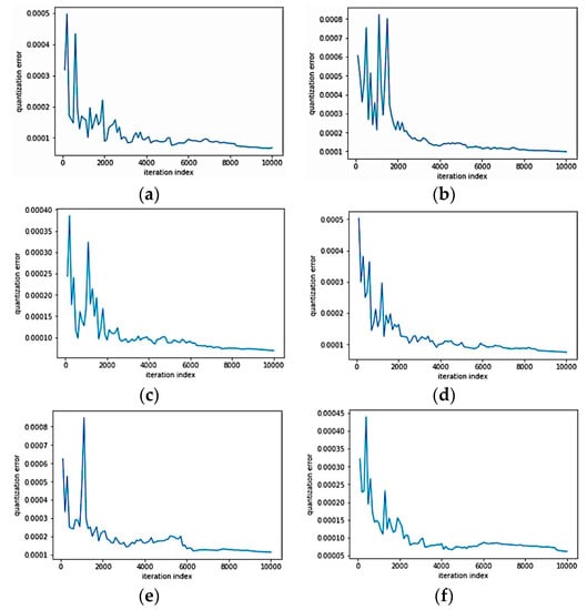The above results were obtained by subdividing the dataset into two bases: training and test bases, with a rate of 70% and 30%, respectively. For each subject, more than 20,480 training samples were processed, namely 14336 samples for training and 6144 samples for the test. The learning errors for channels 1, 2, 5, 6, 11, and 12 during SOM classification are illustrated in Figure 15.