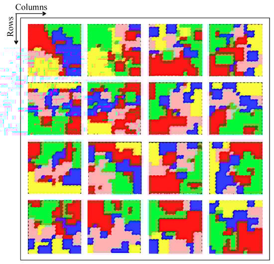 The activation of SOM for the whole training dataset does not provide much information, as the data for the five classes are mixed. These data start to make sense when they are separated according to the classes, as shown in Figure 14. The training dataset was chosen for this figure in order to have a figure with different colors. These tasks form five probabilities. Some neurons are active only in a selected class; these neurons have a probability of 1 for that class and zero for the others. On the other hand, some neurons are not active in any of the three classes; these neurons have zero probability for all classes.