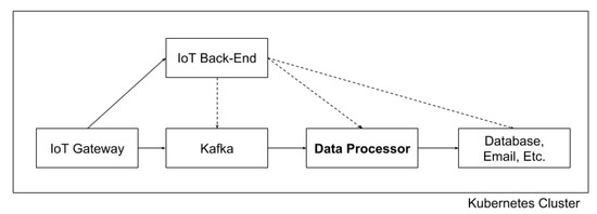 Data processor is a component of IoT platform that consumes messages from the Kafka queue, derives an action to take on the message and acts accordingly by storing the payload into the database, sending out a notification, etc. Data processor polls and processes incoming messages as a stream, i.e., one by one; it is used throughout the paper as an example subsystem. The exact action taken on each message does not matter—the user of the IoT platform can customize it by uploading own processing logic.