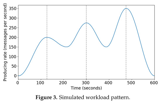As the functional requirement depends on the user, we settled with 95% of message waiting times have to be within 10 s for this test. The data processors are programmed to process at a maximum rate of 100 messages per second. As the test environment has a limitation that only the maximum of 4 data processors can be running at the same time, we only tested workload message rate up to 350 messages per second. A sample seasonal workload profile as in Figure 3 was tested.