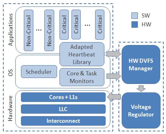 Success of DVFS in the research community as well as industry added more interest to put further efforts into research on more effective DVFS techniques. Almost all architectural works for improving DVFS management techniques are implemented as part of operating systems (OS-managed scheme). However, novel architectures exploit hardware-assisted mechanisms to manage resources [,,]. DVFS does not limit any of the hardware techniques of SoC designers. It even makes it more attractive if DVFS management is assisted with hardware-based control. The reason is that hardware can react faster to power demands. A hardware-managed mechanism can make the idle intervals shorter, thus leading to more power saving. Moreover, hardware-dedicated solutions can better fulfill the task deadlines than the classical software-based solutions at the kernel level []. These are attractive features for systems with strict timing constraints. They entice system architects to choose hardware-based DVFS mechanisms for their designs.
