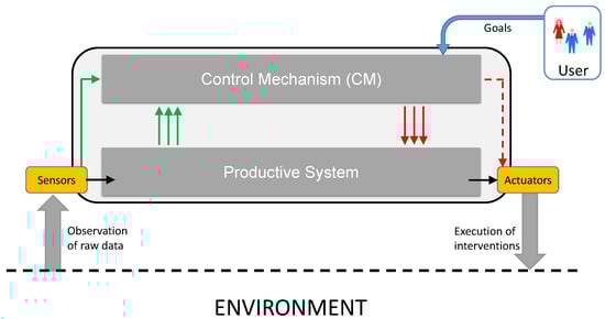 We assume a SASO system S to consist of a potentially large set A of autonomous subsystems . Each is equipped with sensors and actuators (both physical and virtual). Internally, each distinguishes between a productive system part (PS, responsible for the basic purpose of the system) and a control mechanism (CM, responsible for controlling the behavior of the PS and deciding about relations to other subsystems). This corresponds to the separation of concerns between System under Observation and Control (SuOC) and Observer/Controller tandem in the terminology of Organic Computing (OC) [] or Managed Resource and Autonomic Manager in terms of Autonomic Computing []. Figure 1 illustrates this concept with its input and output relations. The user guides the behavior of using a utility function U and (normally) does not intervene at the decision level: Actual decisions are taken by the productive system and the CM. We model each subsystem to act autonomously, i.e., there are no control hierarchies in the overall system. Please note that for this context of this paper an explicit local configuration of the SuOC is necessary—which in turn limits the scope of the applicability of the proposed method.
