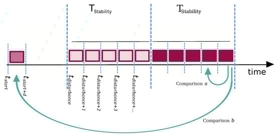 The basic idea is illustrated in Figure 2: The green arrows indicate the comparison of probability distributions as discussed in the context of Challenge 2. We define periods of consecutive estimations and compare the results of the measurements as aggregated value for a certain time frame () against the previous time frame. Therefore, specifies the size of the considered window and d refers to the fixed/sliding window size. In particular, we now shift the focus towards long-term comparisons instead of the one-by-one comparisons. Again, a suitable approach may be the usage of a hybrid technique, i.e., considering both windows: an initial pre-defined window and the previous sliding window. From this general concept, the following research questions have to be addressed: (a) What is a meaningful lower bound for a factor k (number of frames) such that provides meaningful results for a stability estimation? (b) How can the stability be expressed to consider the differences between the observed behavior within different time frames (of size )? and (c) How can we distinguish between a short-term level of stability (i.e., k is 1—in response to an identified disturbance using techniques such as []) and the long-term stability of the system (i.e., k is larger than 1—taking certain interval into account, such as a day)?