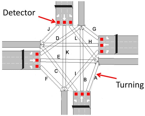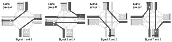 The four-armed intersection shown in Figure 3 consists of four approaching and four leaving sections. The intersection’s topology is defined by the turnings between these sections. Each turning might be signalized by its traffic light or it might share a traffic light (e.g., turnings for straight-ahead and turn-right). Usually, detectors are installed at each turning to determine the traffic stream volumes based on occupancy signals (e.g., realized as induction-loops in the street surface).