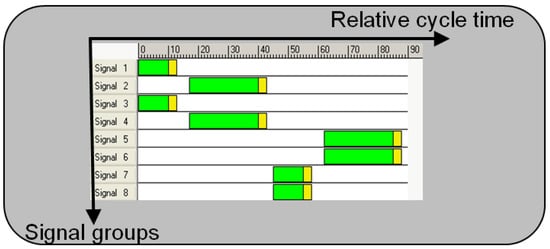 Those turnings with non-conflicting traffic streams are used to form signal groups (see Figure 4). Based on these signal groups, the signal plan can be defined. Consider the signal plan in Figure 5 that shows the duration of green and yellow periods for signal groups A to D from Figure 4. At other times, the so-called interphases, all traffic lights show red to avoid accidents with conflicting streams. Together, the green, yellow and red periods define the cycle time. After completing a full cycle, the signalization starts again. For coordination purposes, intersection controllers of neighbored intersections with the same cycle length can be synchronized by determining an “offset”, i.e., a relative start of the synchronized phase within the cycle.
