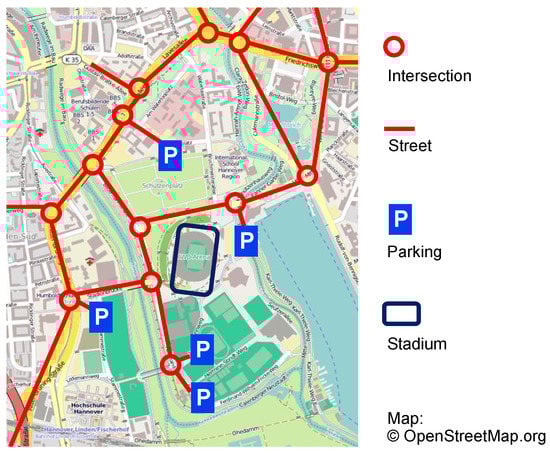 The simulation is performed—as mentioned before—using the traffic simulation toolkit Aimsun NG Professional []. Aimsun is an abbreviation for “Advanced Interactive Microscopic Simulator for Urban and Non-Urban Networks”. The simulator is an integrated transport modelling software, developed and licensed by Transport Simulation Systems (TSS) from Barcelona, Spain. In general, professional microscopic traffic simulators such as Aimsun are simulation tools that aim at emulating the flow of individual vehicles through urban road networks as realistically as possible. To capture the full dynamics of time-dependent traffic phenomena, a large part of current microscopic traffic simulators rely on the theory of car-following, lane changing and gap acceptance models to model the particular behavior of vehicles. Therefore, both global and local phenomena have influence on the individual vehicle’s behavior—details on the theoretical parts are, e.g., given in []. Traffic engineers of authorities make heavy use of these simulators to plan and optimize the traffic control strategies and topology of intersections in cities worldwide.