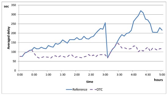 Averaged delays in the simulation for the reference solution and the OTC controlled simulation.