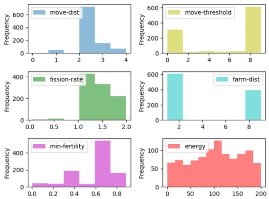 In contrast to the OTC scenario described in Section 5.1 and similar to the swidden farming model, we face a variable number of agents (or subsystems). We again increase the number of parameters—but even more challenging—we also increase the configuration space in terms of the number of possible values each parameter can have. This results in a significantly increased number of different parameter constellations.