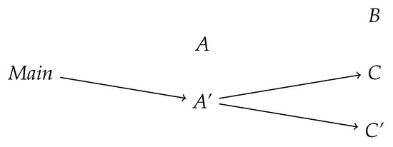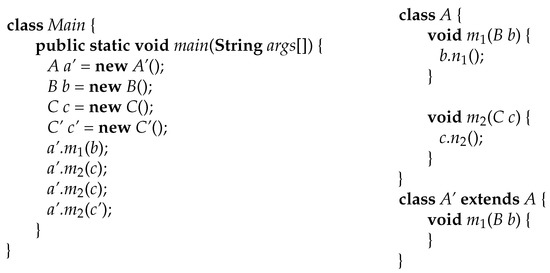 In the example code starting at the main method, we have 4 calls from Main to A′, as 4 methods of the object (of type A′) are called, and no call from Main to A, even though of course the method m in A′ is in fact implemented in the class A. There are no outgoing edges from the class A, since no object of type A is created during the program run. The method a′.m(b) does not result in a method call from A or A′ to B or B′, since the method m of A′ (which is executed in this case) does not perform any operations on the object b. The method calls a′.m(c) (performed twice) and a’.m(c′) result in two calls from A′ to C and a single call from A′ to C′, since the method m calls a method from the object c.