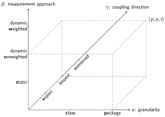 To distinguish these 18 types of measurement, we use triples , where is c or p and indicates the granularity, is s, u, or w and indicates the basic measurement approach, and is i, e, or c, indicating the direction of couplings taken into account. Figure 5 illustrates these three orthogonal choices: The example triple denotes an analysis with granularity package-level, using dynamic unweighted analysis, and considers coupling in the import direction.