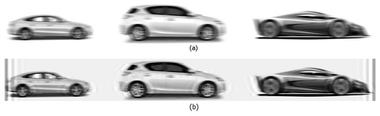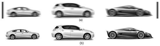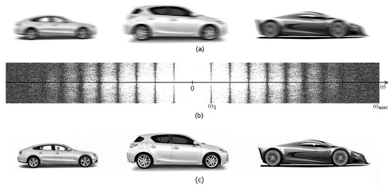 Further, we assume that the cars move at the same speed and therefore give the same smear in the image: Δ = const = 20 pixels or the cars are stationary, but the camera moves uniformly during the exposure. Image I is smeared horizontally according to (1) using the head program Autos.m as well as the m-functions fspecial.m and imfilter.m at Δ = 20. In this case, a “boundary condition” is used in the m-function imfilter.m with the option ‘circular’. Figure 2a presents a smeared image (see smeared driver’s head and wheels).