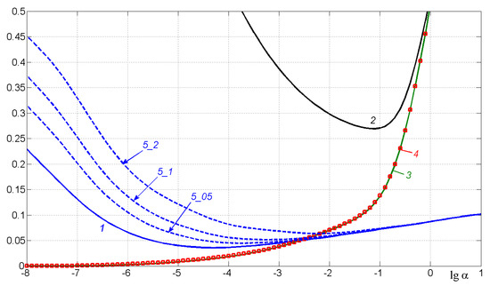 where M is the number of rows and N is the number of columns in the image. Such an expression for the image error can be used only in the case of model image processing when is known (e.g., the image in Figure 1b). Figure 5 presents the curves for different variants of solutions. One can choose the value of α from the minima of these curves.