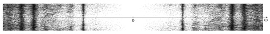 In order to solve the inverse problem of image restoration, one needs to know the dependence (19) Δ(x) of the smear from x. However, we usually do not know this dependence in practice, or we can visually estimate it according to Figure 6 only approximately. To determine Δ(x), we use the spectral method, as in Figure 2b. Figure 7 presents the Fourier spectrum in modulus |G(ω)| of the distorted image g(x, y) in Figure 6.