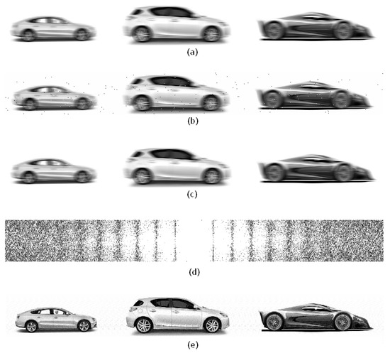 In the above results, we do not take into account the influence of noise; therefore, we obtain clear restored images in Figure 2, Figure 4 and Figure 9. Let us consider the influence of noise on the results of image processing for example of impulse noise (of type ‘salt & pepper’) with intensities 0 and 255 [10,24,25,26].