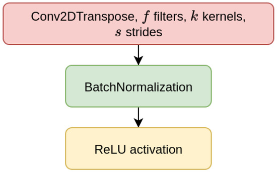 The CAE model is the concatenation of an encoder (Figure 4), composed by three EBlocks (Figure 1), and a decoder (Figure 5), composed of three DBlocks (Figure 2). Between the encoder and the decoder parts, the latent layer is a Dense layer with linear activation, whose goal is to embed the data into a latent lower-dimensional vector space. Depending on the considered window size (200, 500, or 1000), the latent layer has a different number of nodes: 100 nodes for the CAE 200, a latent space of size 150 for CAE 500, and 200 neurons for CAE 1000. All the convolutional layers use the padding “same”, which enforces the same output size padding with zeros. The CAE 200, CAE 500, and CAE 1000 structures are detailed in Table 1.