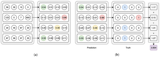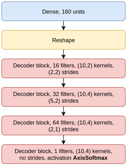 Both model types use the Softmax activation for the last layer and categorical cross-entropy as the loss function—in the CAE models these functions are applied in their per-axis version (Figure 3a,b). We have used an early-stopping criterion based on the improvement of the validation loss—if no improvement is observed within 10 epochs, the training is interrupted. The maximum possible number of epochs is set to 1000, but we note that using this criterion, no model went over the 100 epochs of training in our experiments. In the following Section 3.1 and Section 3.2 we point out the peculiarities of, respectively, the CAE and the CNN models.