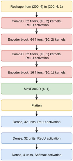 As shown for the CNN 200 model in Figure 6, the CNNs we designed are composed of two convolutional layers intertwined with EBlocks, followed by a MaxPooling and a Flatten layer (a layer that transforms the bi-dimensional output of a convolutional layer into a one-dimensional vector), and then a sequence of Dense layers on top, which terminates with a Dense layer with four output neurons and Softmax activation.