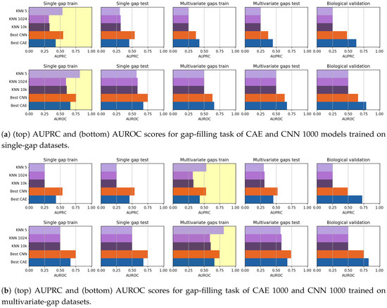 Table 21. Win-Tie-Loss tables between the best CAE 1000 model, the CNN 1000 model and knn-imputers on the Gap-filling task. The Win-Tie-Loss table has been built by comparing the performance achieved by the models on the validation set (excluding the biological set) through a Wilcoxon signed-rank test (p-value threshold 0.05 ). The knn always loose when compared to either the CAE 1000 or the CNN 1000.