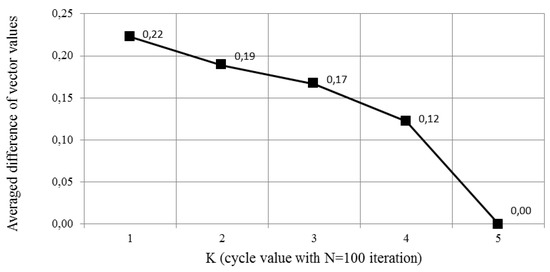 To demonstrate the convergence of the method, independent modeling iterations were performed. In each cycle, changes in the density of the vector were recorded after calculation using Equation (6). Figure 7 present the average change value of the parameter vector while 100 independent iteration. The final decision, the value of the vector corresponds to the following composition of equipment and measures: the application of monitoring the condition of the pump windings, and the emergency opening of the drain valve. Vector B = {0, 0, 1, 0, 0, 0, 1, 0, 0} is optimal, with a total cost of S = 210, and qfire = 4.99 × 10−7 and qo.l. = 7.43 × 10−7. The results of the dynamics of the vector during updating after each modeling cycle of 100 iterations is presented in Figure 8.