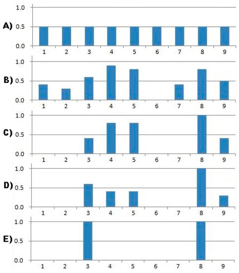 Dynamics of the probability vector : (A) initial state, (B) modified after 1st cycle, (C) modified after the 2nd cycle, (D) modified after the 3rd cycle, (E) final state.