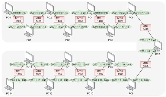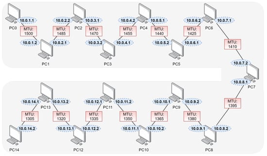 A virtual environment is created using the Oracle VM VirtualBox software, the scenario described in Figure 1, with fifteen machines using the Debian 8.7.1 operating system. Each computer is also assuming the role of the router, having two network adapters that always connected to a different IPv4 network, except the first and the last. Each network adapter had different MTU values according to the proposed scenario.