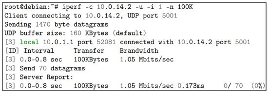 In PC0, the parameters used were iperf -c 10.0.14.2 -u -i 1 -n 100K -b 10G, with -c to assume the client mode. 10.0.14.2 being the IP of the server that received the requests, -u to use the UDP protocol, -i 1 to determine the time of 1 s to display the output report, -n 100K to determine the number of bytes for transmission and -b 10G to determine the 10G band, as shown in Figure 3.